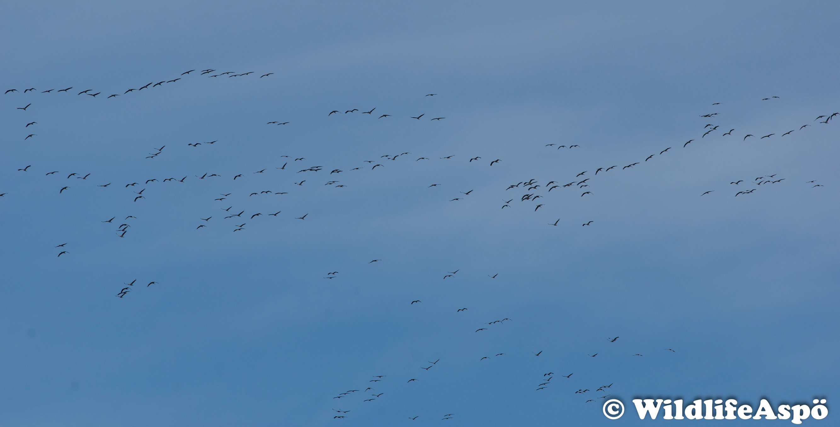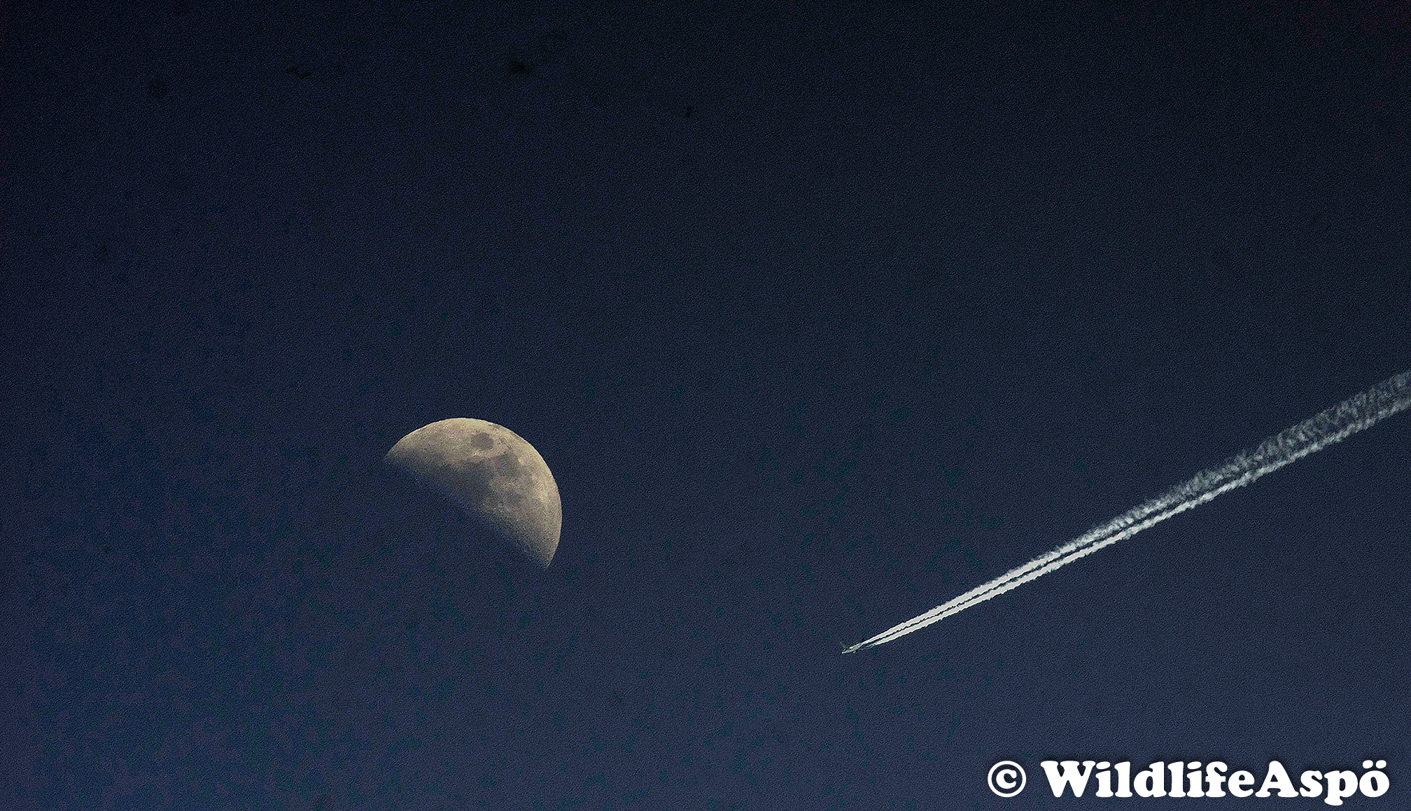 Aspö är belägen längs flyttfågelrutten mellan Öland och Skåne. Vid gynnsamma vindar är ön en bra plats för att skåda gäss, änder och tranor, men även rovfåglar som hökar, vråkar, glador och örnar. Vitkindade gäss och tranor är vanligast, där ett rekordantal om ca. 3000 tranor flyttade förbi under två timmar en tidig oktoberdag 2016 (Bild 40). Många ’stålfåglar’ passerar också ön dagligen på väg mot nordöst eller sydväst, dock inte till månen (Bild 41).